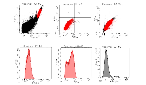 将细胞制备成单个细胞悬液,并用特定的荧光染料孵育细胞,流式细胞仪通过检测器接收激光照射液流内单细胞产生的光信号,经过光电转换和统计分析,从而反映细胞物理化学特征和细胞功能。流式细胞术是对个细胞理化性能进行定性和定量分析的常用技术。